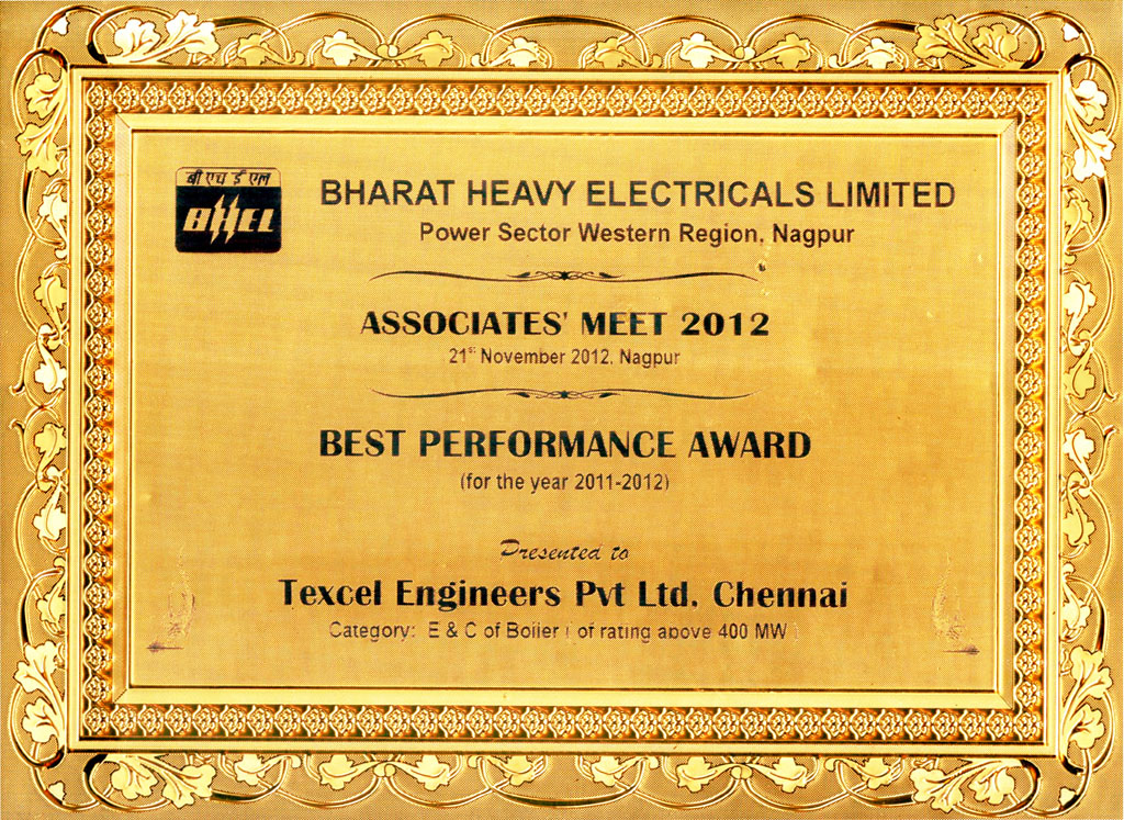 Best perfomance Award from BHEL, Western region for the year 2011-2012. |